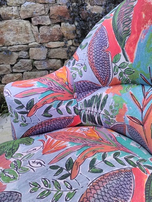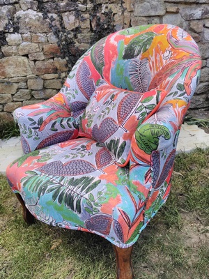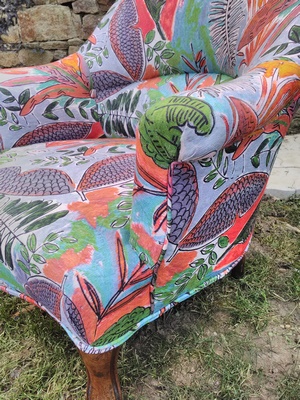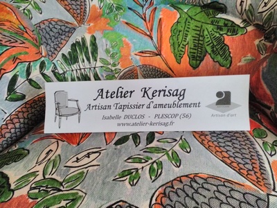 J’ai pris beaucoup de plaisir à réaliser ce fauteuil crapaud qui a une âme artistique, avec le tissu jungle orange de Lalie Design , éditrice et créatrice de tissus d’ameublement ; une créatrice locale, bretonne. C’est une création unique, avec une disposition des différents morceaux de tissus pour une harmonie des couleurs.
